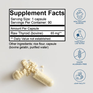 Each capsule contains 65 mg of raw desiccated New Zealand bovine thyroid. Other Ingredients Include: rice flour, capsule (bovine gelatin, purified water)