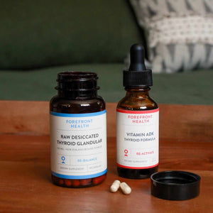 Progesterone & Vitamin E can help to re-balance thyroid-suppressive hormones by reversing estrogen dominance, the aromatization of testosterone into estrogen, inhibiting prolactin production, and deactivating the body’s stress response.